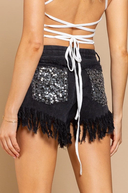 High rise denim shorts designed with fringe detailing on hem, frayed edge detailing and sequin pocket on back.