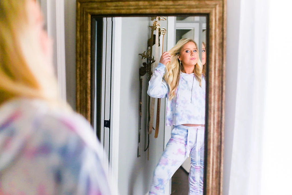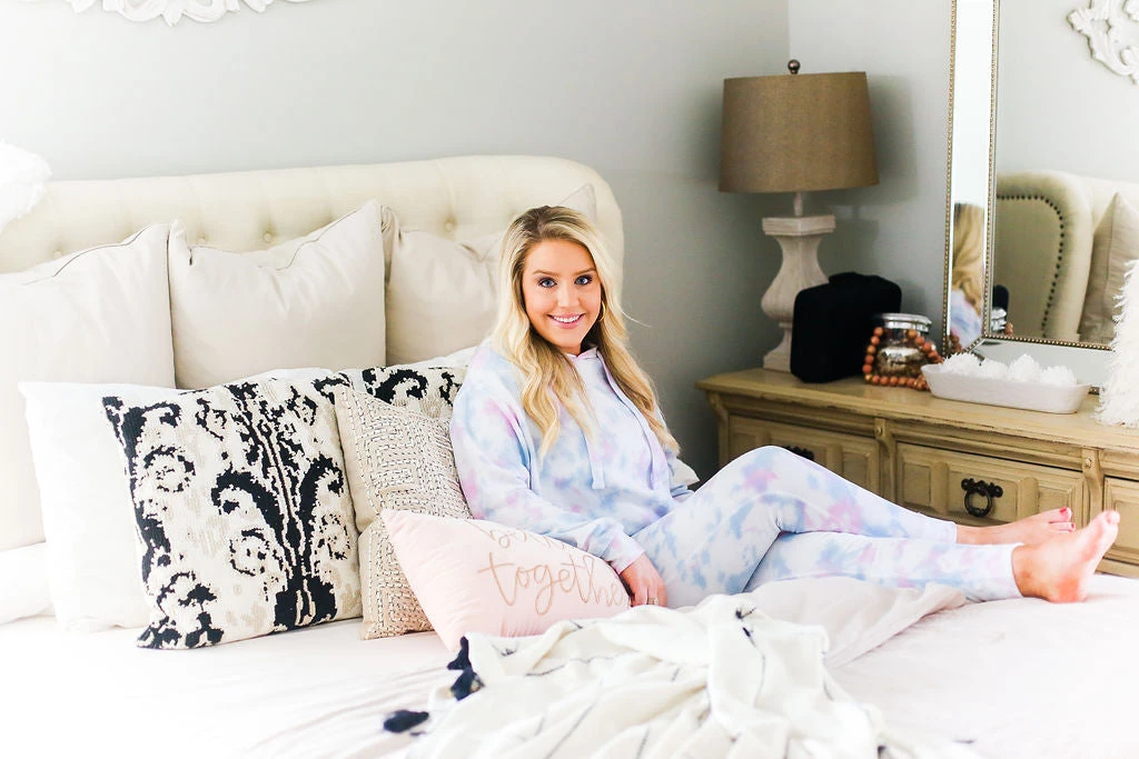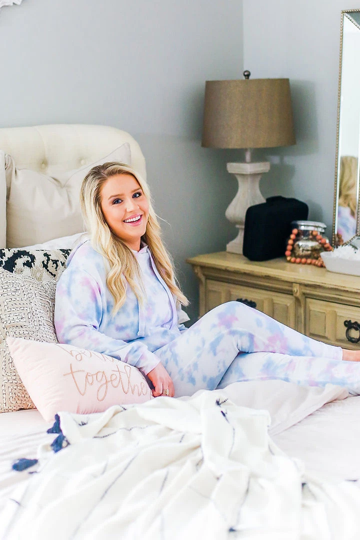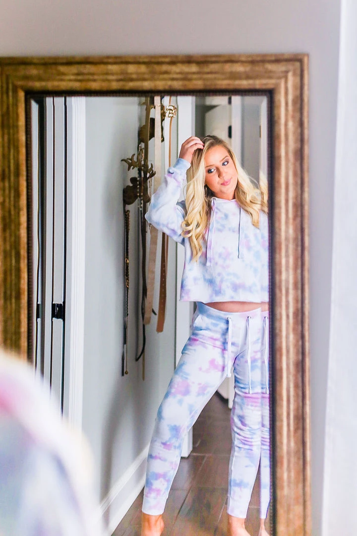 Cozy blue and pink tie dye brushed fleece cropped hoodie featuring an adjustable drawstring and cropped raw hemline.