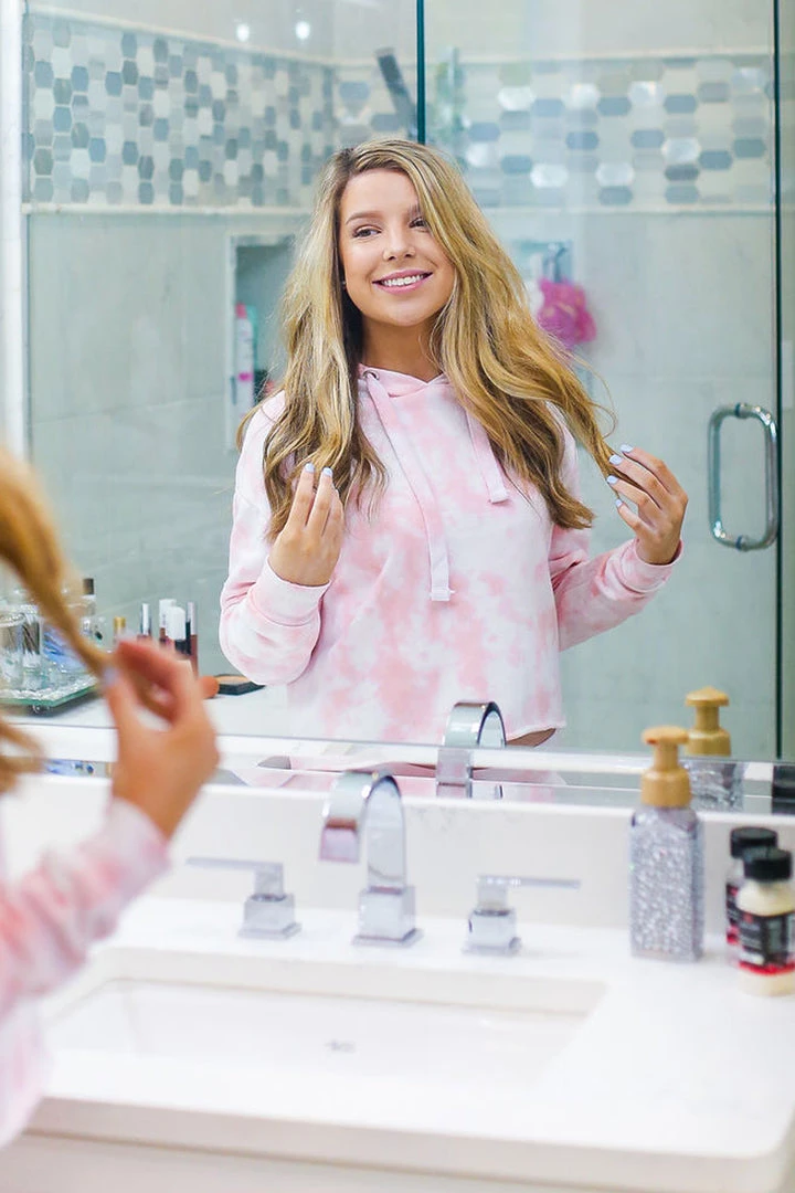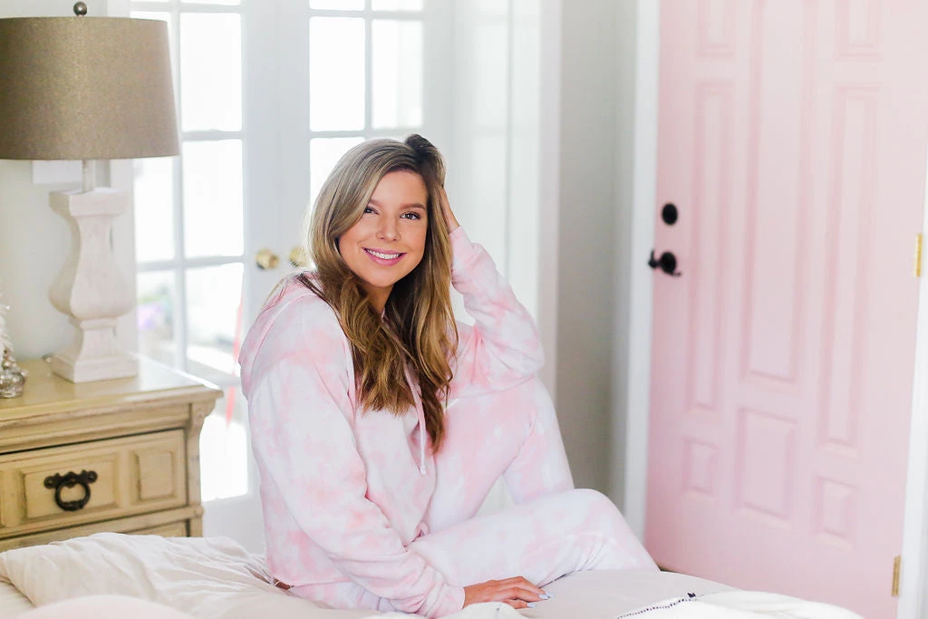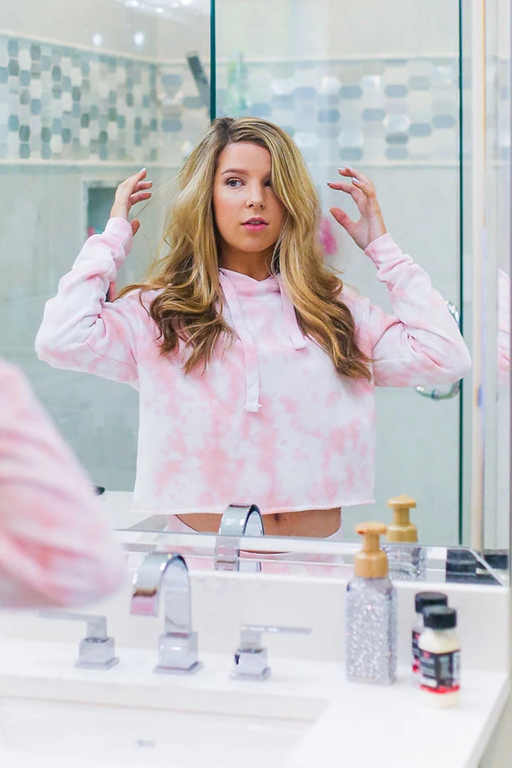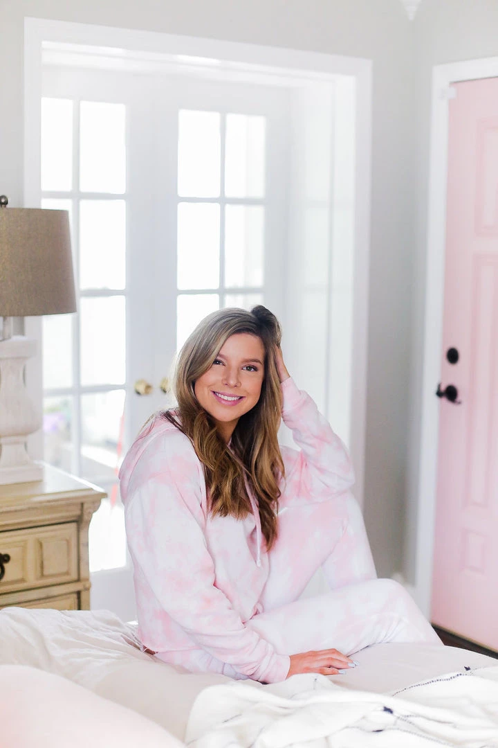 Cozy pink tie dye brushed fleece cropped hoodie featuring an adjustable drawstring and cropped raw hemline.