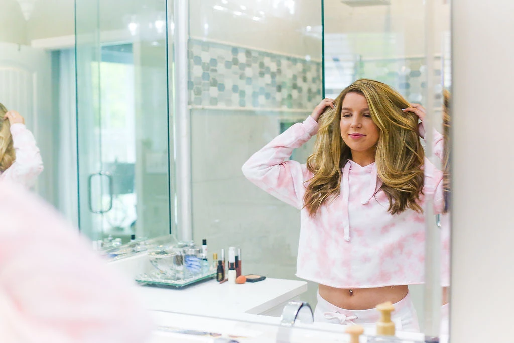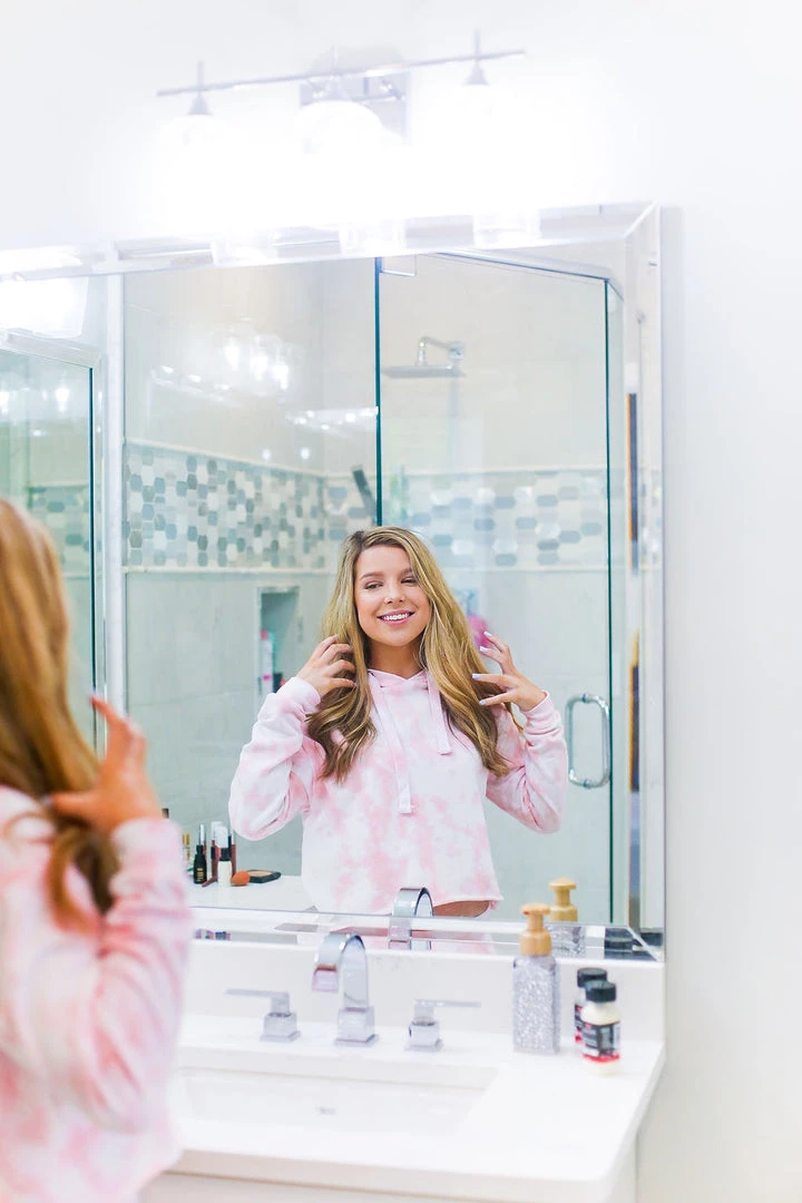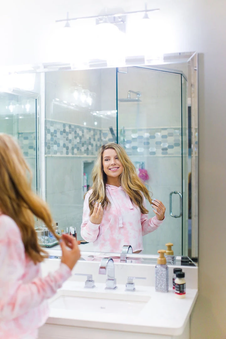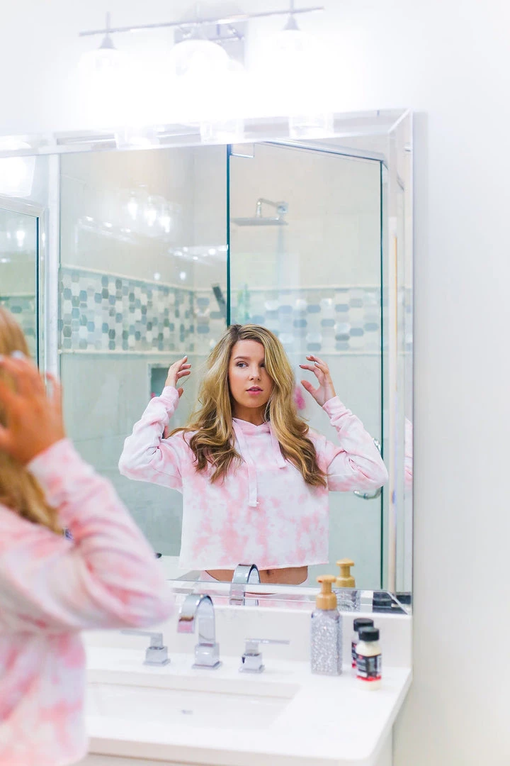 Cozy pink tie dye brushed fleece jogger pants featuring an adjustable drawstring waist, with side and back pockets.