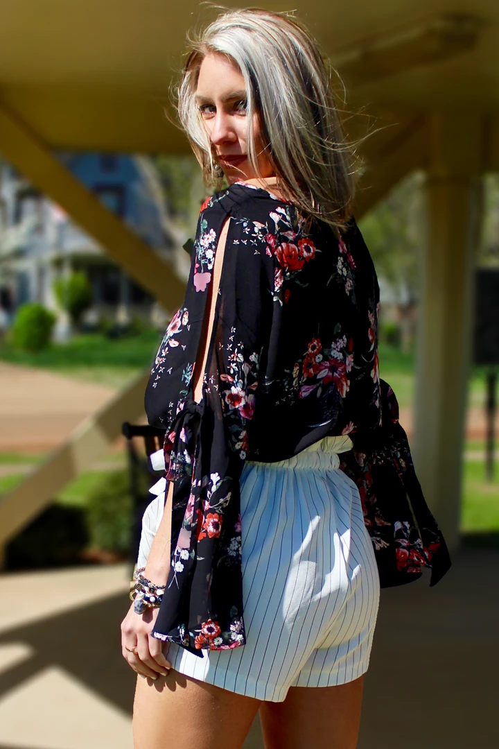 Obsessing over this new floral top! Lively hues of coral, mint green, pink and white pop out on the dark black background. The lightweight fabric gives it a romantically delicate style and makes it the perfect blouse for spring, summer and fall. The sleeves feature an open cutout all the way down the arm that finish with a dramatic bell sleeve and tied together by a dainty bow. This top is sure to leave an impression! Tuck it into your favorite high waisted shorts or rock it with bold white jeggings and some wedges.Â