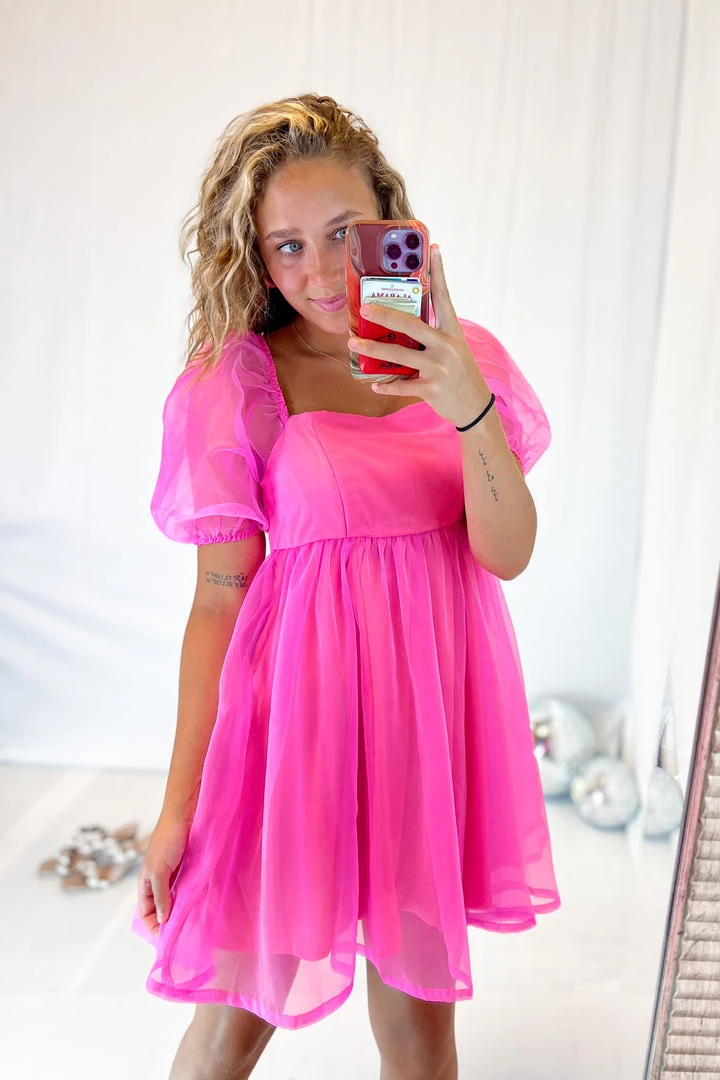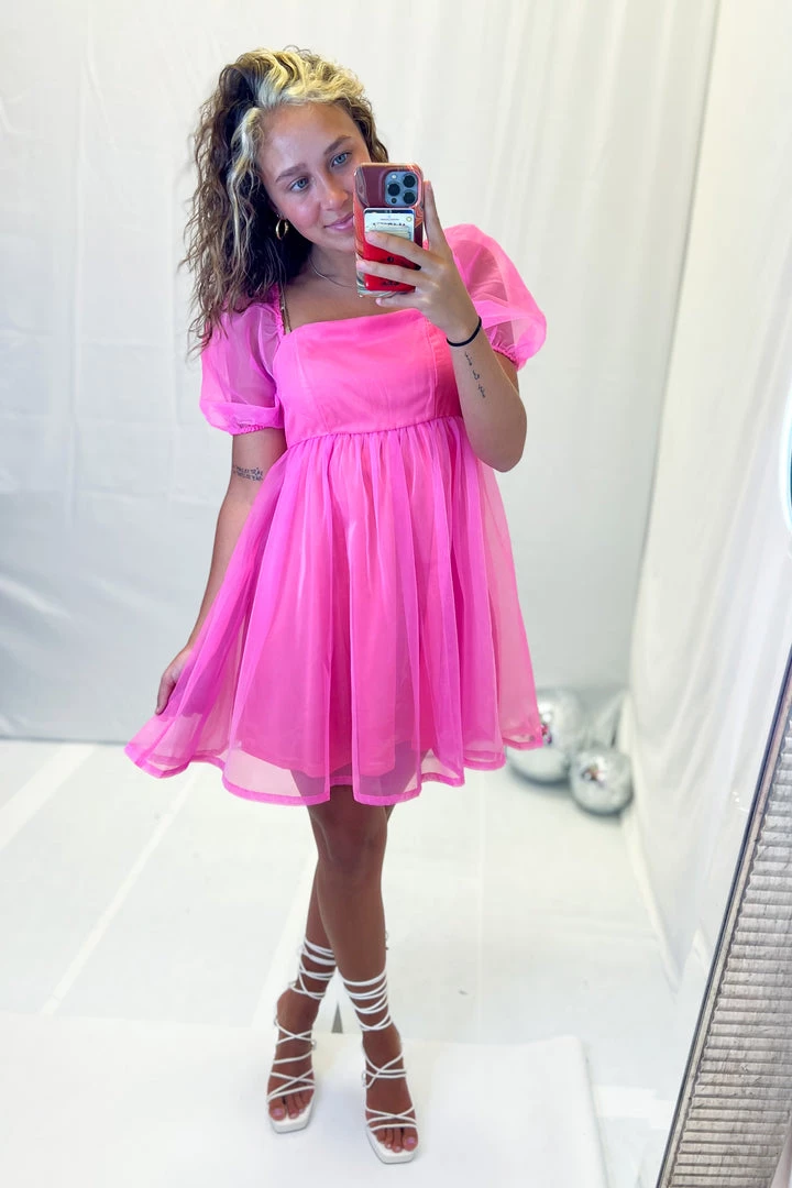 TCEC Women’s Clothing Barbie Pink Puff Sleeve Babydoll Dress