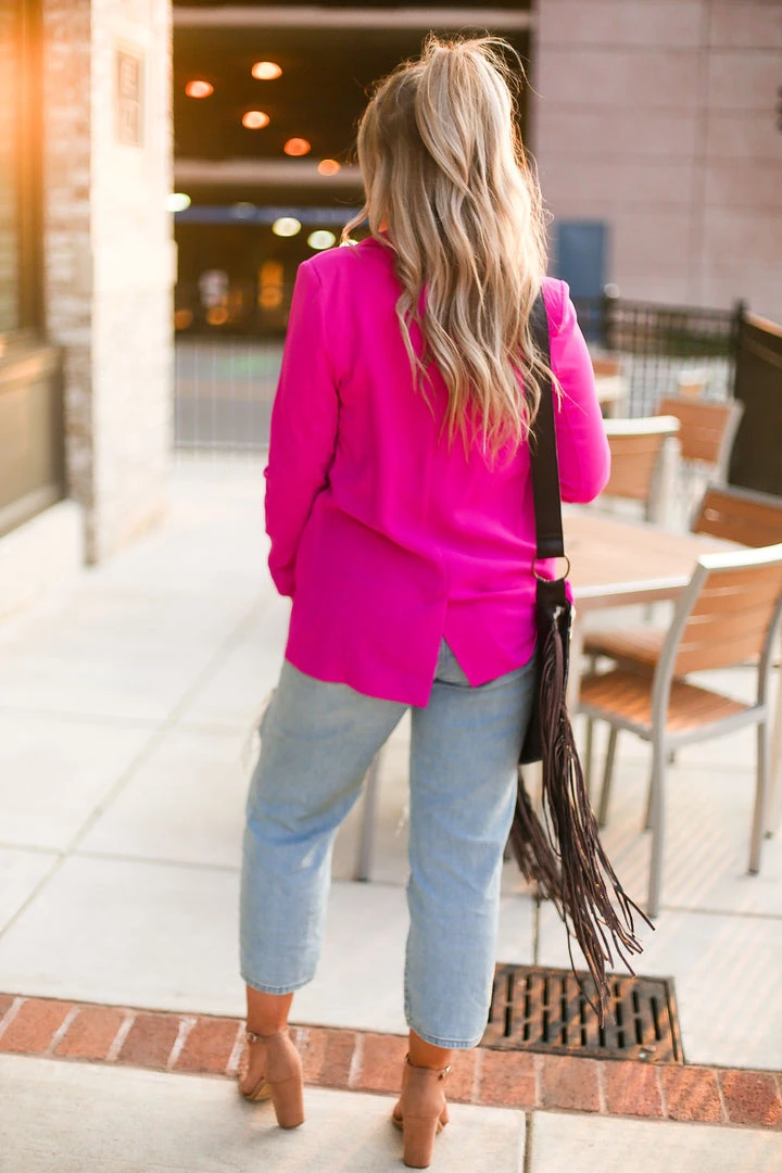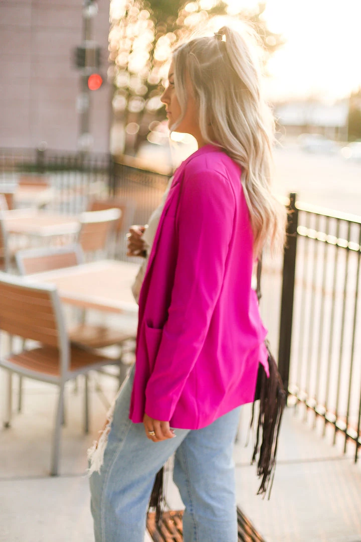 This chic magenta pink blazer jacket is for all the hard working ladies out there who love a little pop of color in their wardrobe! This jacket features a boyfriend fit, matching lapels and pockets.