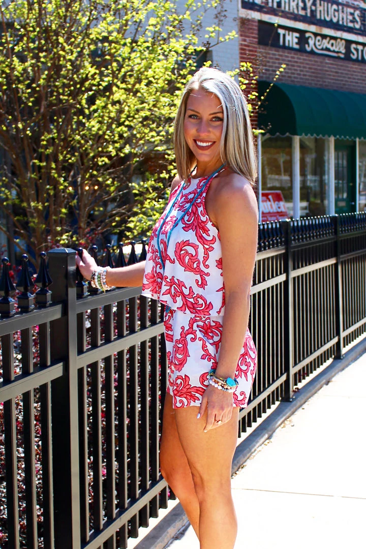 This vivacious coral and white printed romper features a shoulder-baring halter neckline and popover top. It’s the perfect addition to your summer vacation outfit!