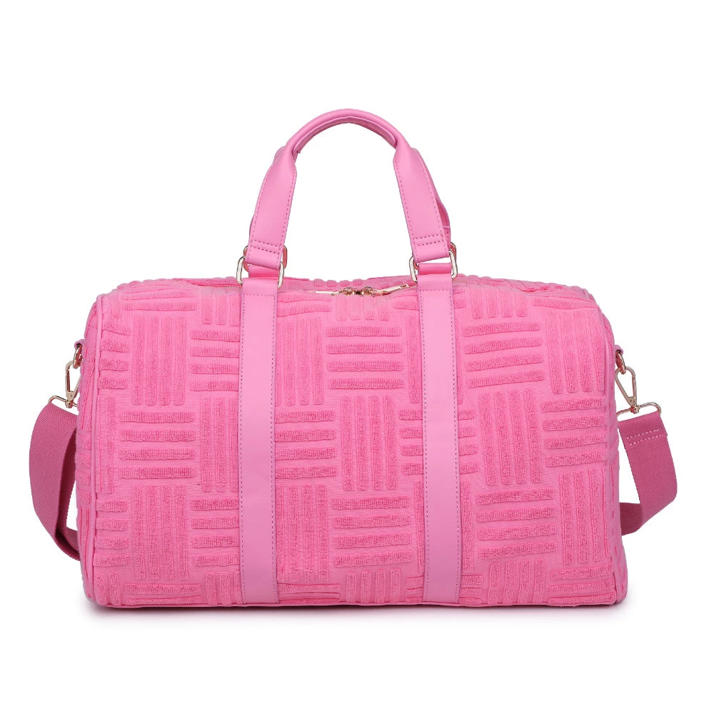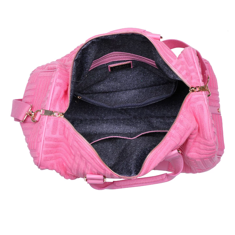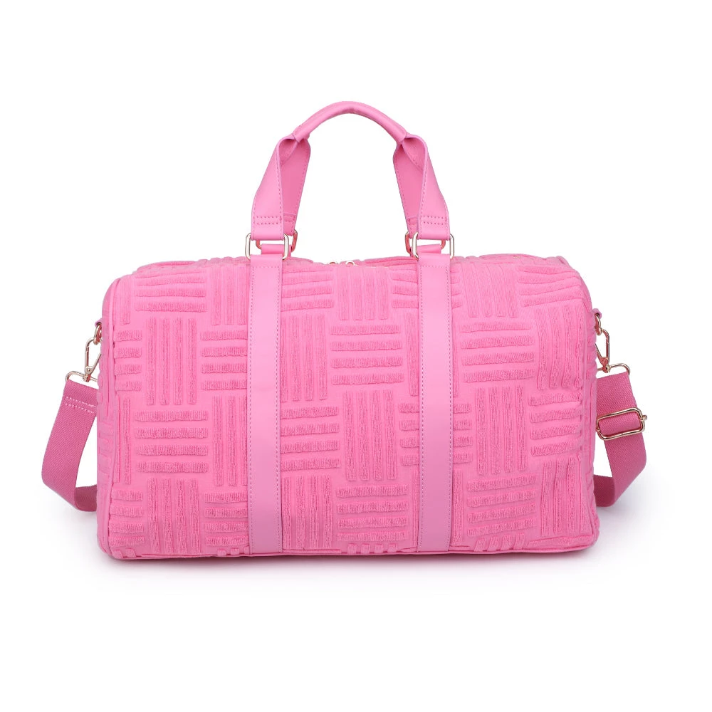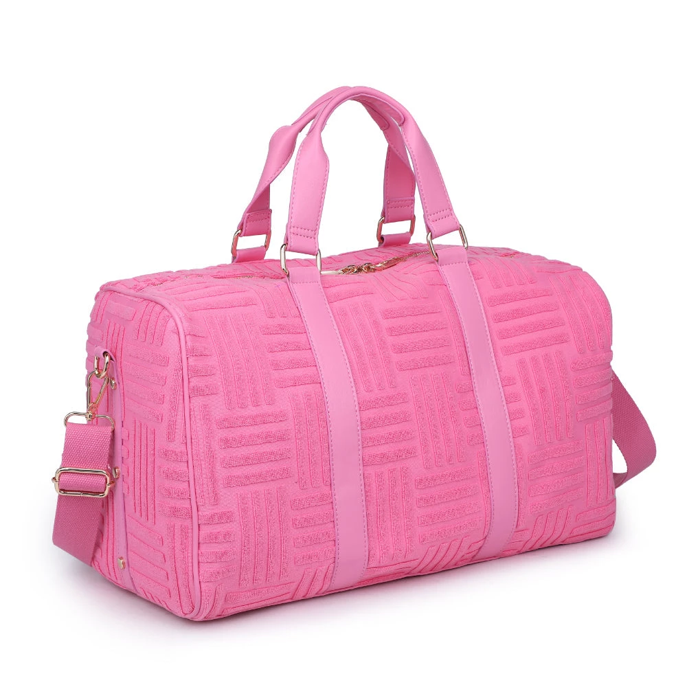 Make a bold statement with our Pink Terry Towel Embossed Weekender Bag.Â