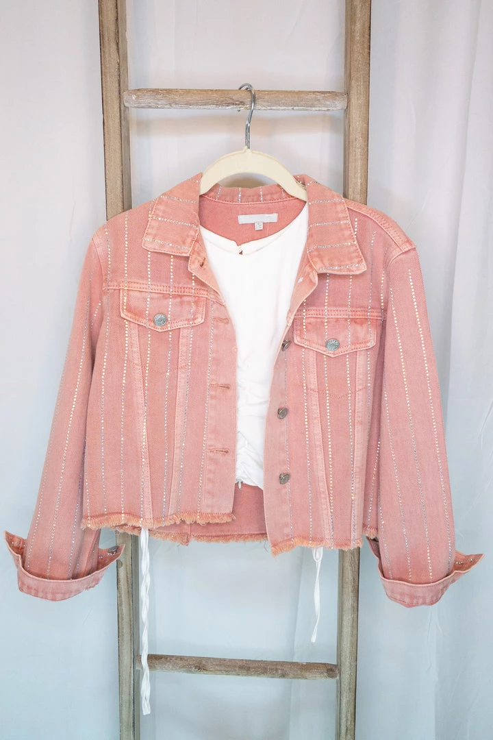 The classic pink wash blue jean jacket just got a major upgrade! Featuring an open front bodice with silver buttons, flashy rows of rhinestone details throughout and raw hems. Style this denim jacket with some chunky white booties and a cute graphic tee!