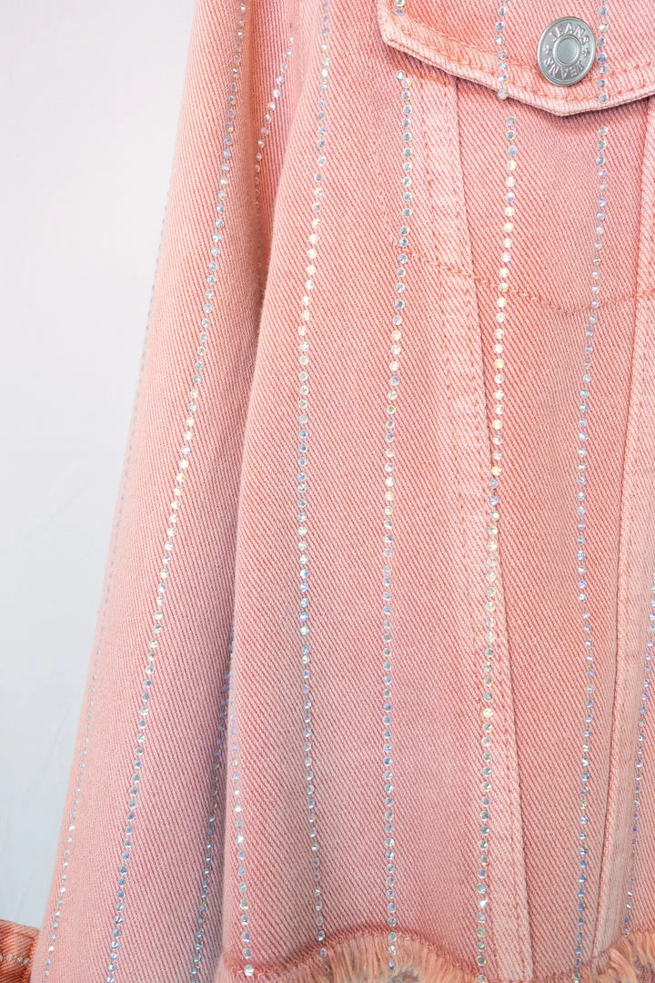 This jacket is a showstopper! The pink denim is soft, and the rhinestones are beautifully placed. The raw hem adds a modern twist. I’ve received so many compliments while wearing it.
