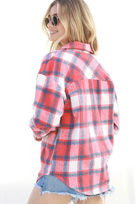 Cute red and blue plaid button down. Complete with front pockets, snap buttons and a soft, thick knit fabric.