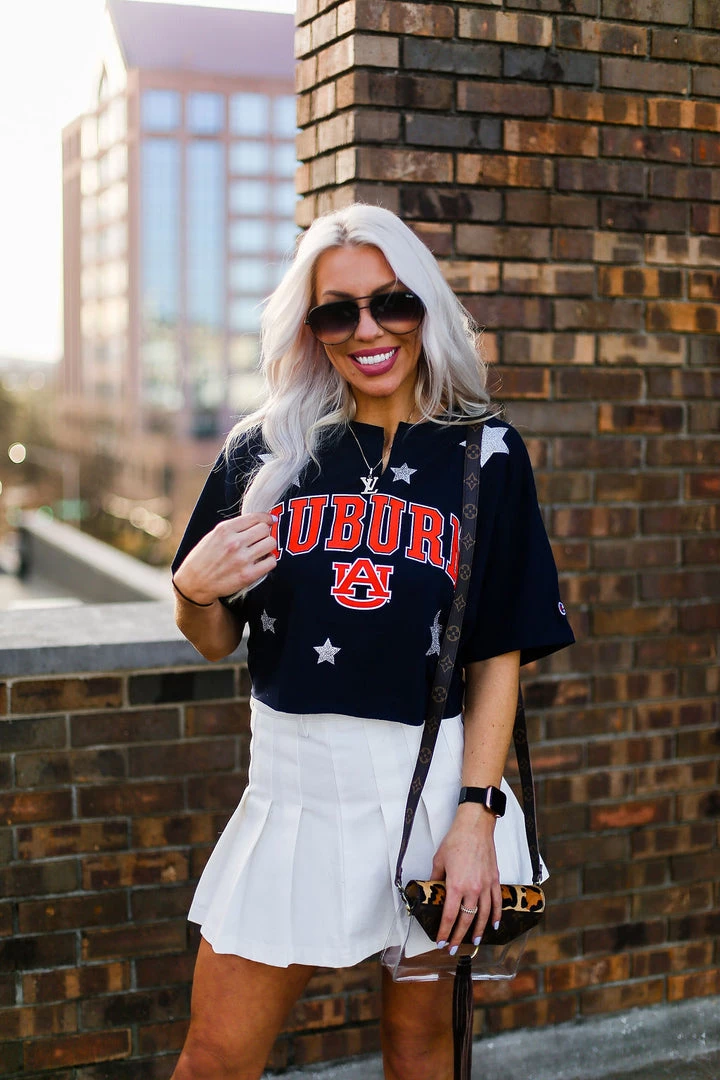 Auburn University game day cropped graphic t-shirt with glitter stars all over.