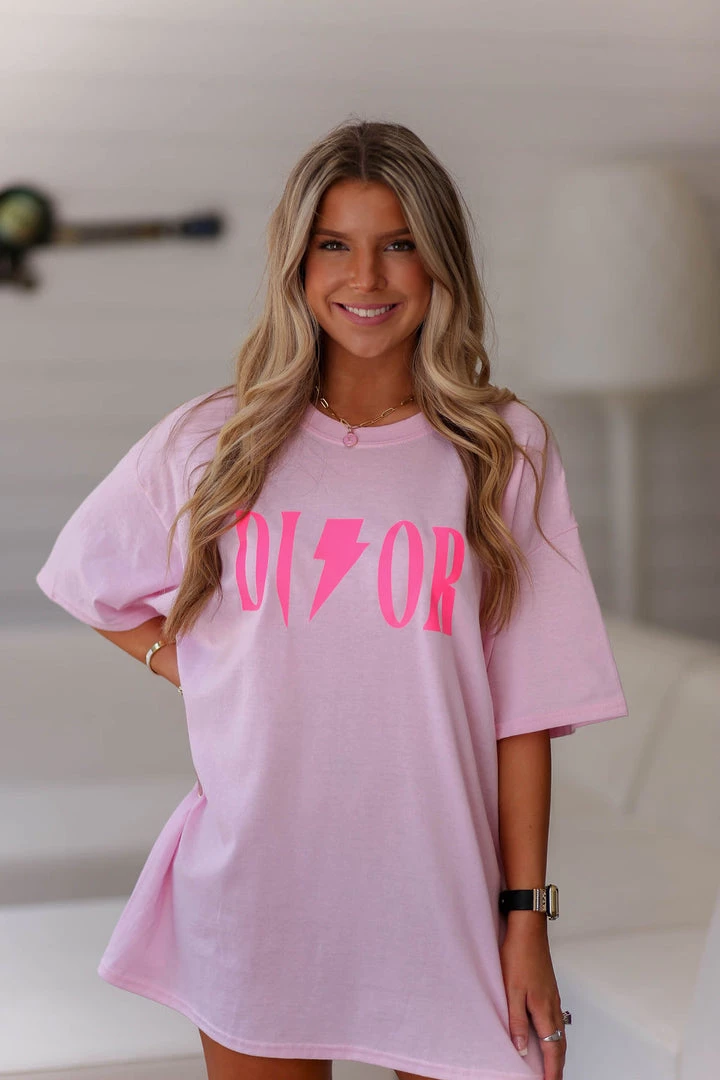Trendy baby pink graphic tee with lightning bolt and skull.