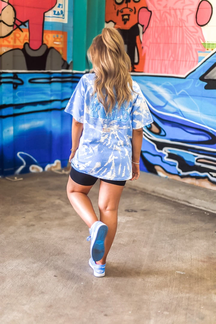 Trendy blue tie dye Astroworld graphic tee with tour dates on the back and distressing throughout.