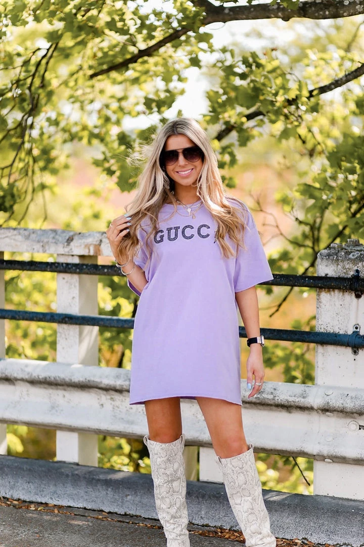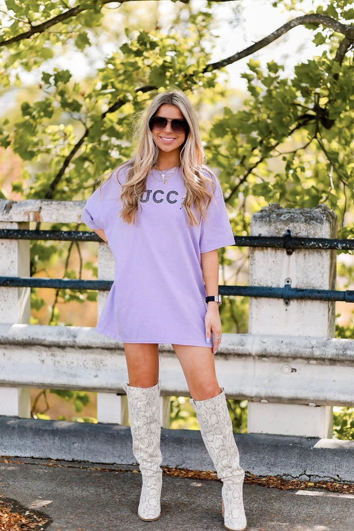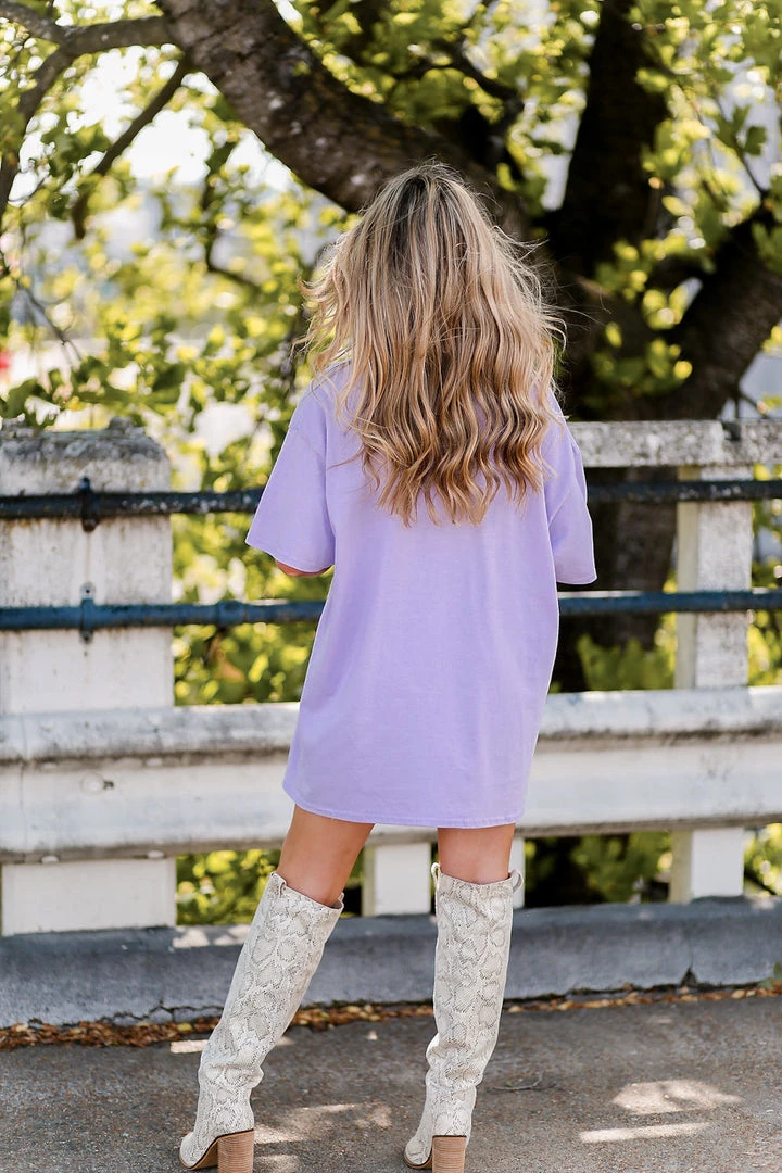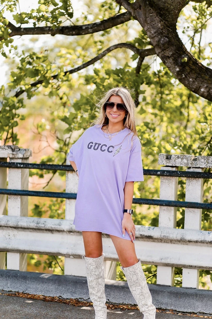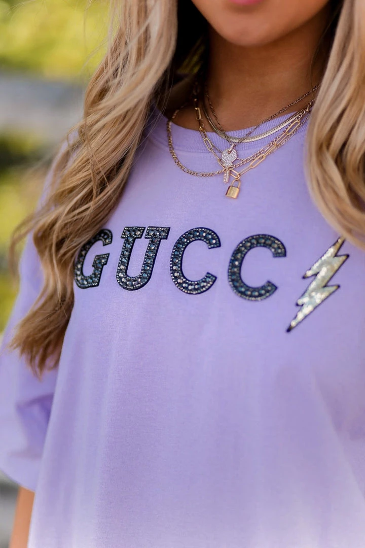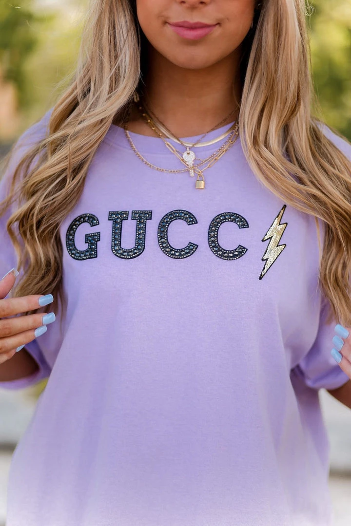Vibrant lavender purple oversized tee with designer inspired black jewel letters and sequin lightning bolt.