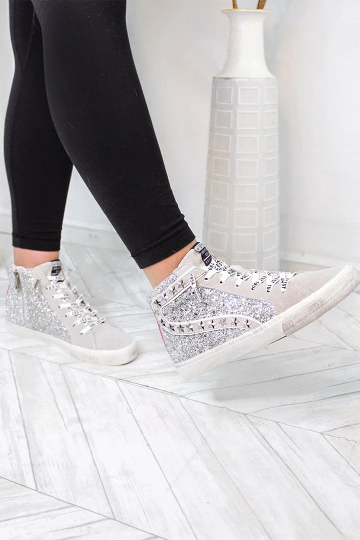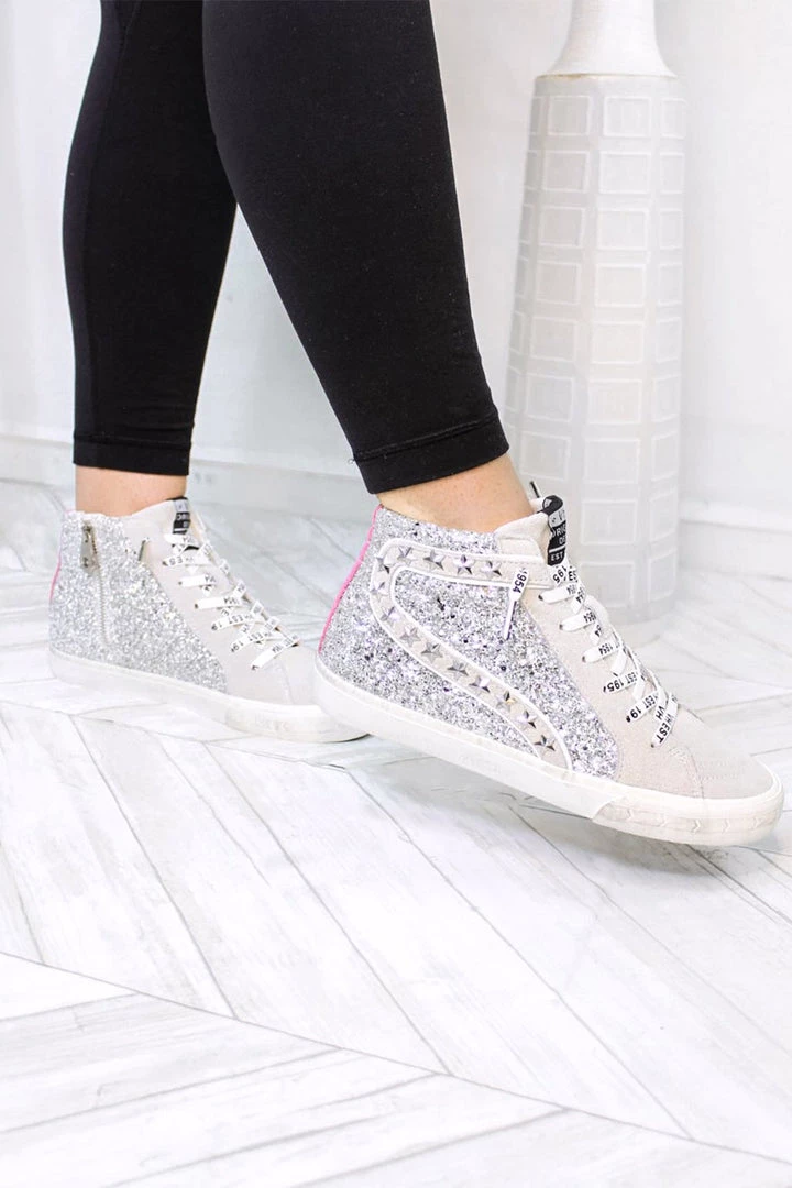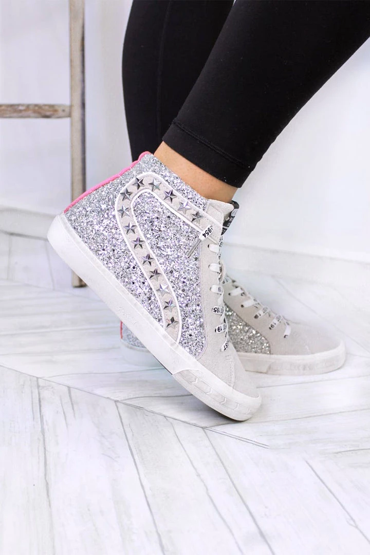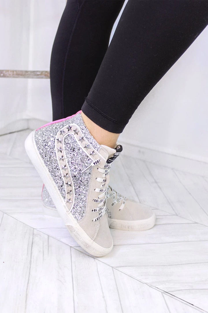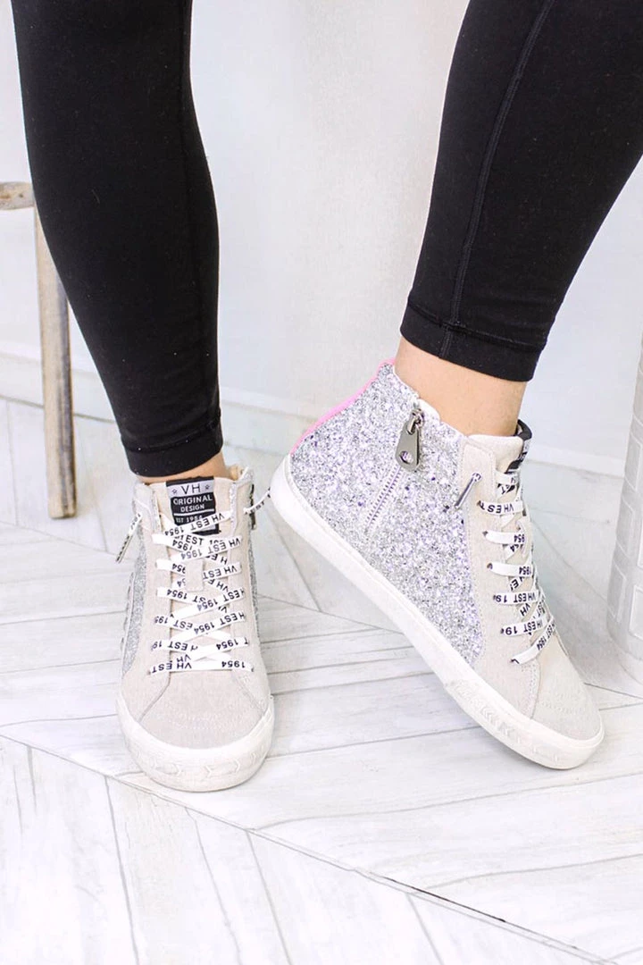 Step out in style with the Vintage Havana Ray Pink Stripe Glitter High Top Sneakers! This stylish shoe features silver glitter on both sides contrasted with a beige front and trendy hot pink stripe on the back. The signature VH stars on one side paired with original Vintage Havana laces give this comfortable sneaker a little extra flare!