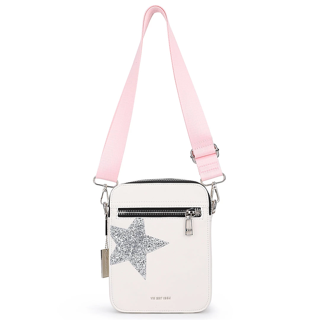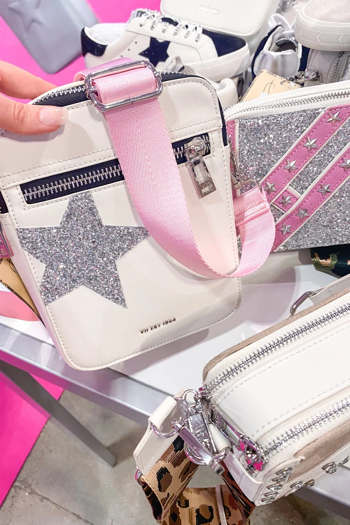 All the glitz and glam in one bag! We love this crossbody purse from Vintage Havana featuring a glitter star with two adjustable straps.