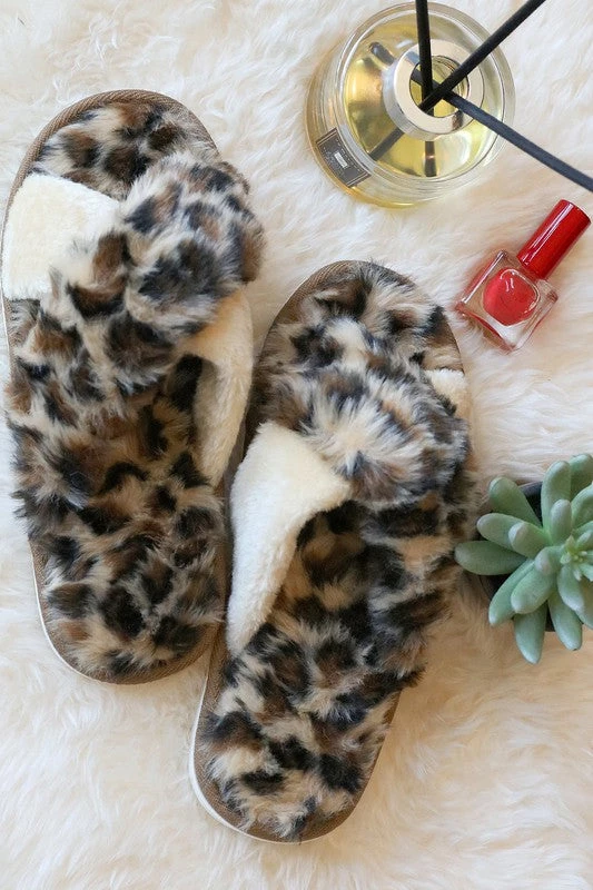 Slip on these snuggle-worthy fluffy slippers and throw on your favorite pajama set for the best night in! Featuring a faux fur contrasting Brown and ivory leopard pattern.